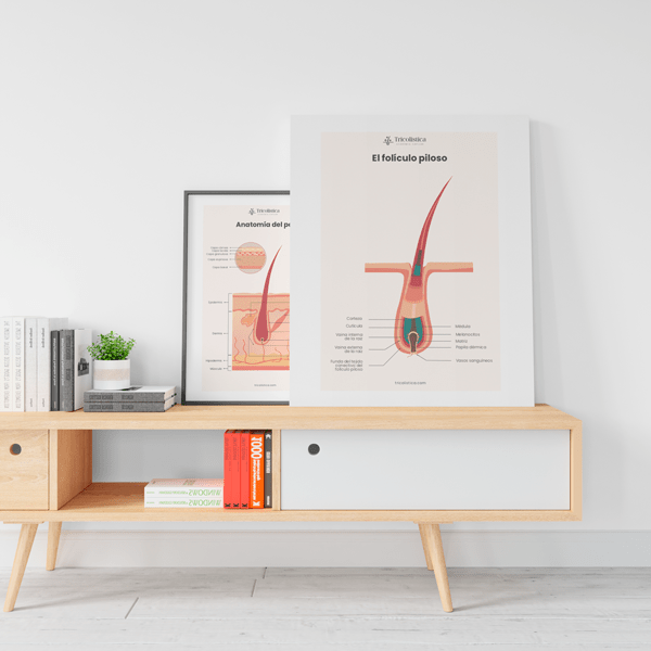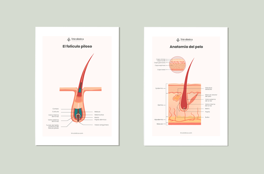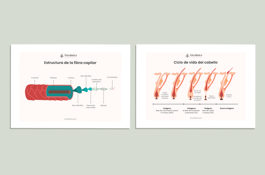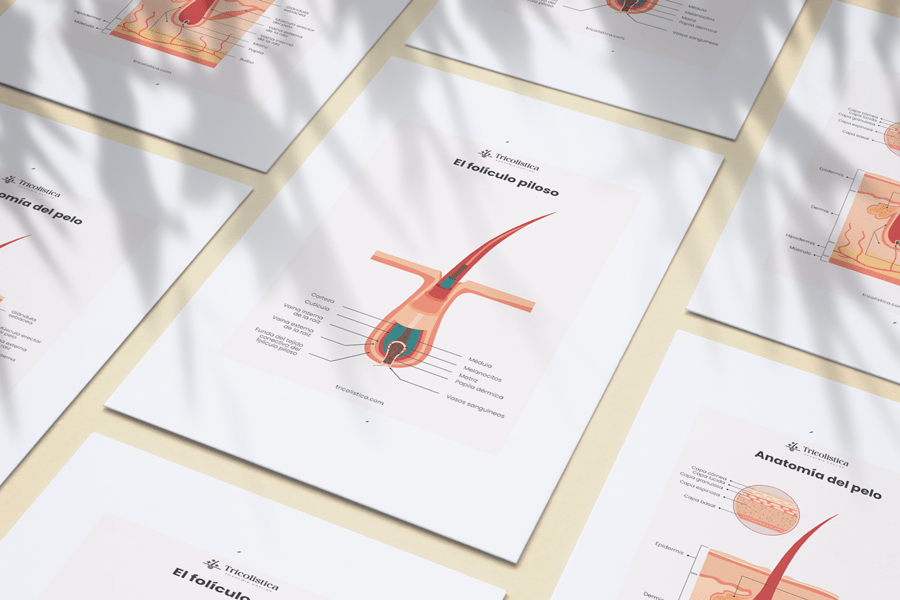 Pack de 4 posters profesionales explicando los conceptos fundamentales de tricologia. Pueden ser utilizados tanto en una consulta tricológica como en un salón de belleza o peluquería. El propósito principal de los posters es educar e informar.