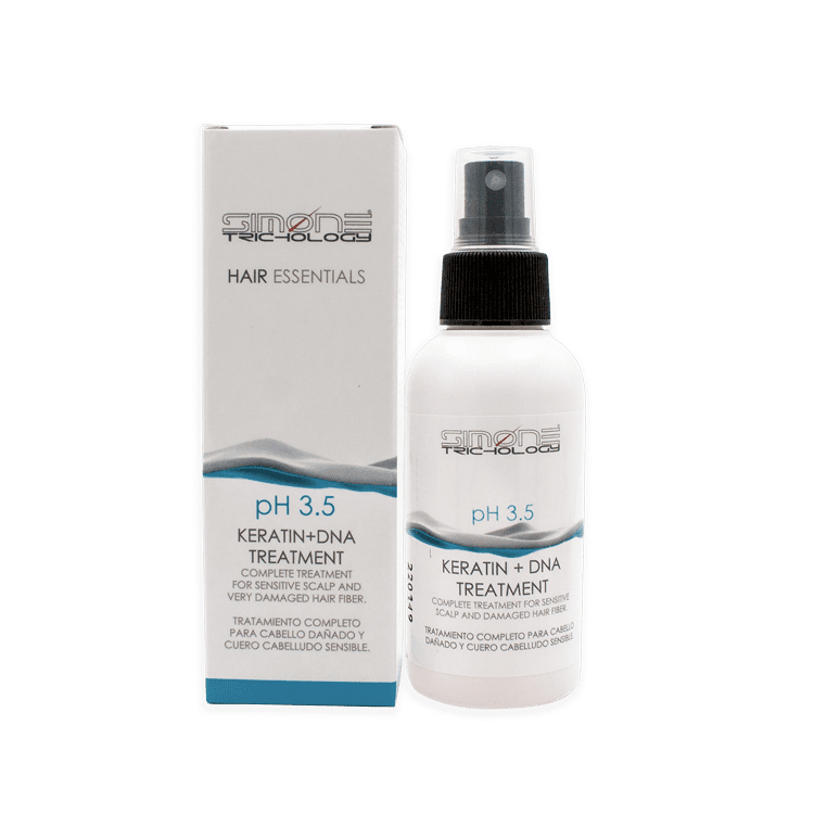 SIMONE TRICHOLOGY Keratin + DNA Tratamiento es un tratamiento desarrollado por SIMONE TRICHOLOGY que actúa minimizando picores y rojeces en el cuero cabelludo y regenerando las estructuras del tallo capilar deterioradas por tratamientos químicos inadecuados, efectos de tracción constantes, fuentes de calor y factores medioambientales tales como exposición a los rayos u.v.a., aguas salinas, etc…